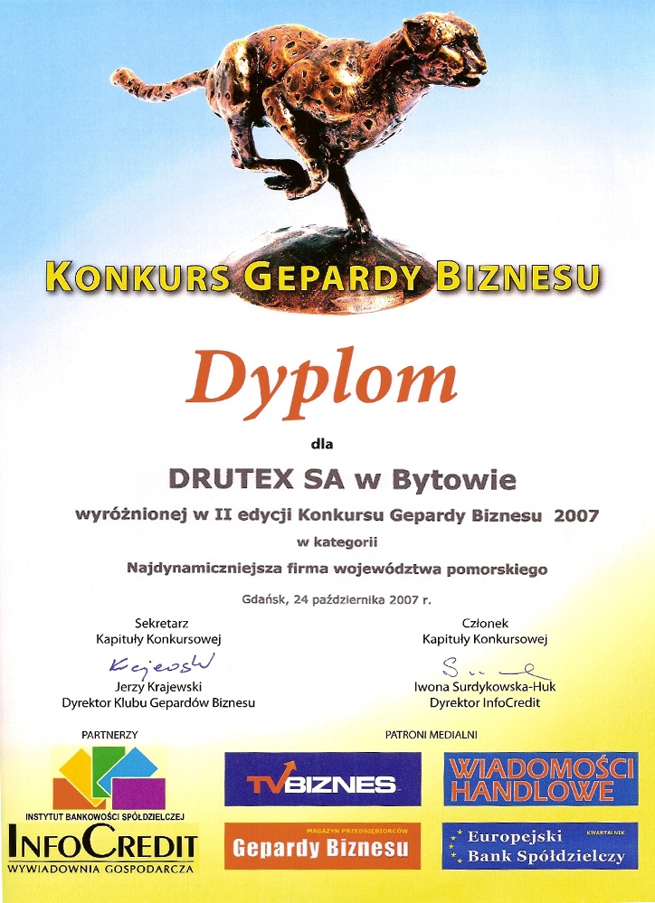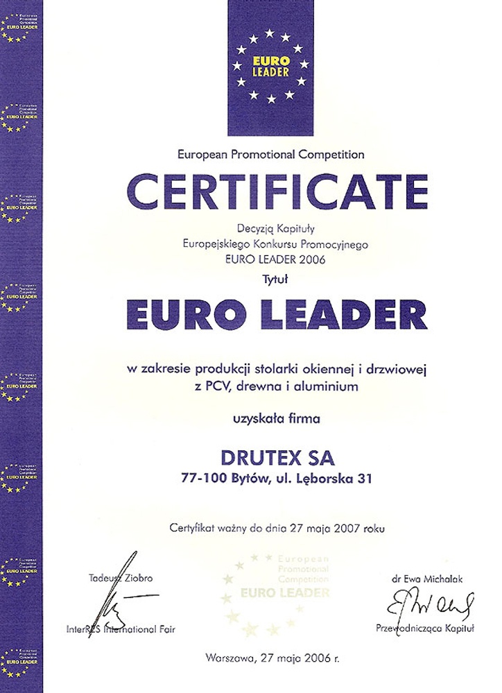 Ciągłym dążeniem firmy DRUTEX S.A. jest zaangażowanie w realizację działań związanych z zapewnieniem najwyższej jakości oferowanych produktów, która pozwoliłaby jednocześnie zbudować uznanie wśród nowych Klientów przedsiębiorstwa oraz pielęgnować renomę firmy wśród odbiorców dotychczasowych, zarówno w kraju jak i za granicą.